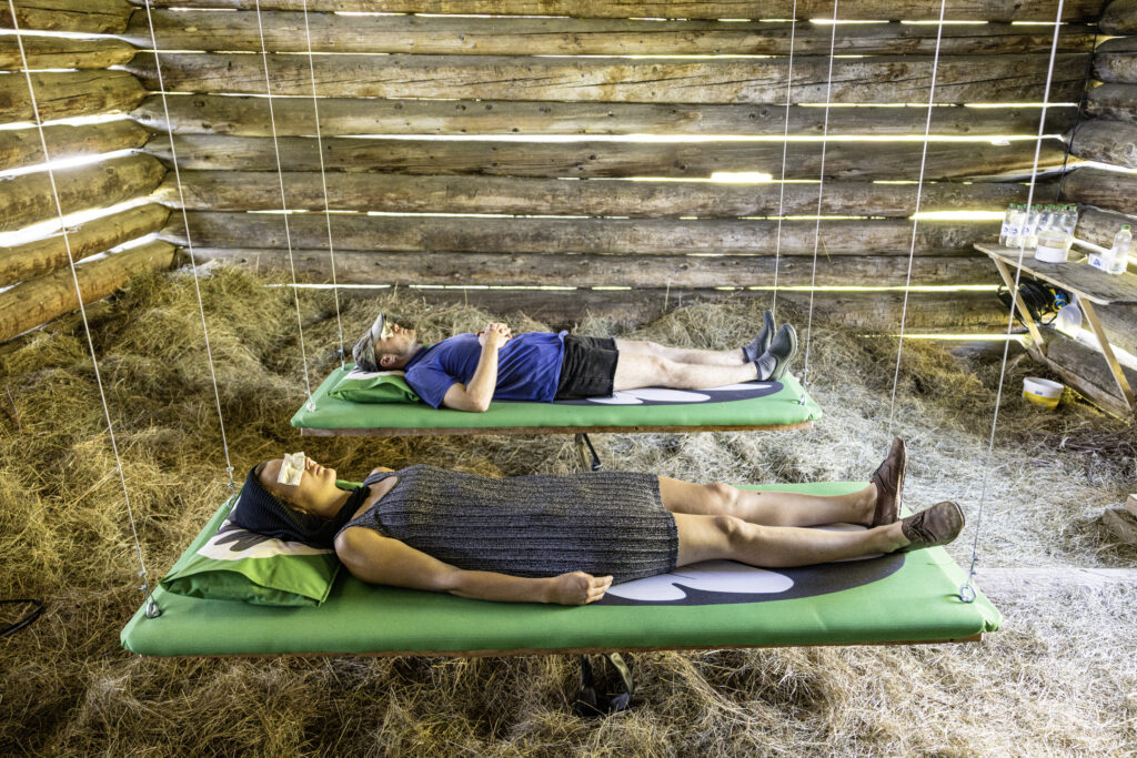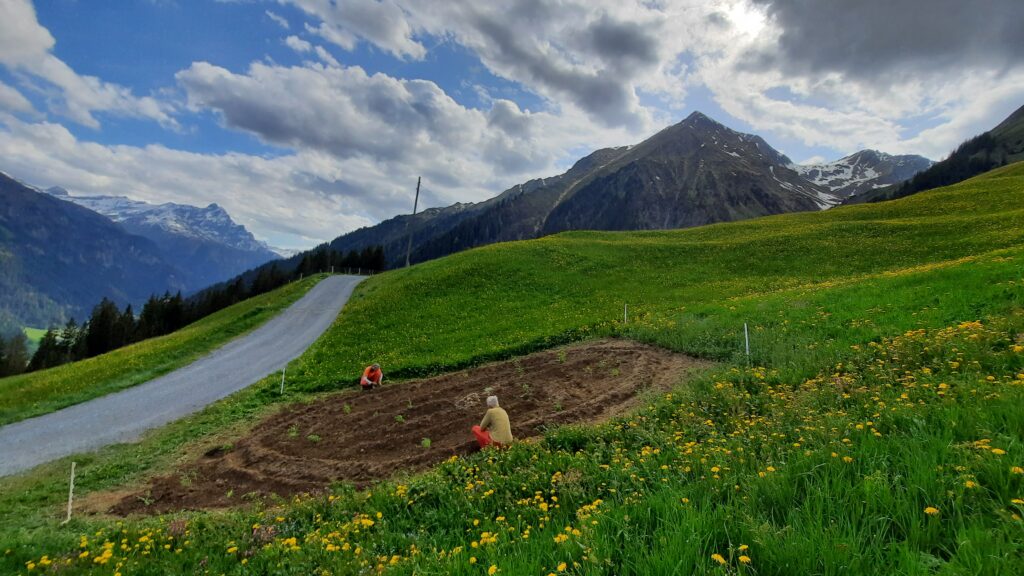 Das Künstlerduo hat im Bergdorf Tenna unter dem Titel «Ackergold» einen Garten mit 13 verschiedene Kartoffelsorten, Kräutern und Blumen angelegt, der sich im Laufe des Sommers zu einem pflanzlichen Gesamtkunstwerk entwickelt. Weiter laden sie an zwei Orten auf Liegen ein, um sich und die Augen auszuruhen: während man in einem abgelegenen Waldstück sanft wiegend in