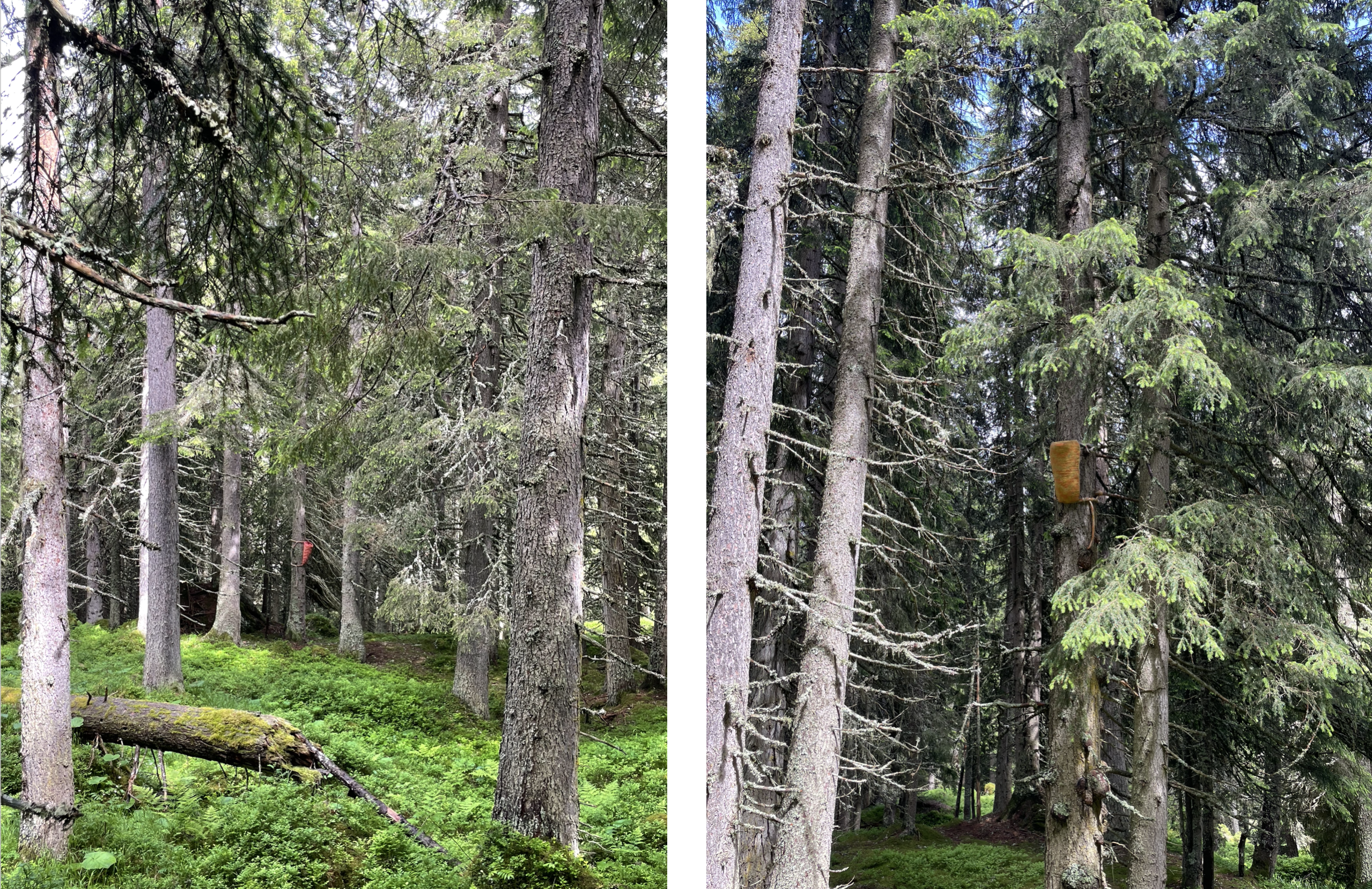 Three sculptures reminiscent of harvest containers and nests, made of felted and naturally dyed wool, are attached to fir trees in the Bawald forest. Metaphorically, they are intended to collect stories about possible futures as dreams. The material connects different animals, spaces, plants and people with each other, encouraging reflection on these relationships and their future from. The tweed pattern is a tribute to the Tenna Tweed company, which produces hand-woven fabrics from the wool of sheep from the nearby Zalön farm. (JI)